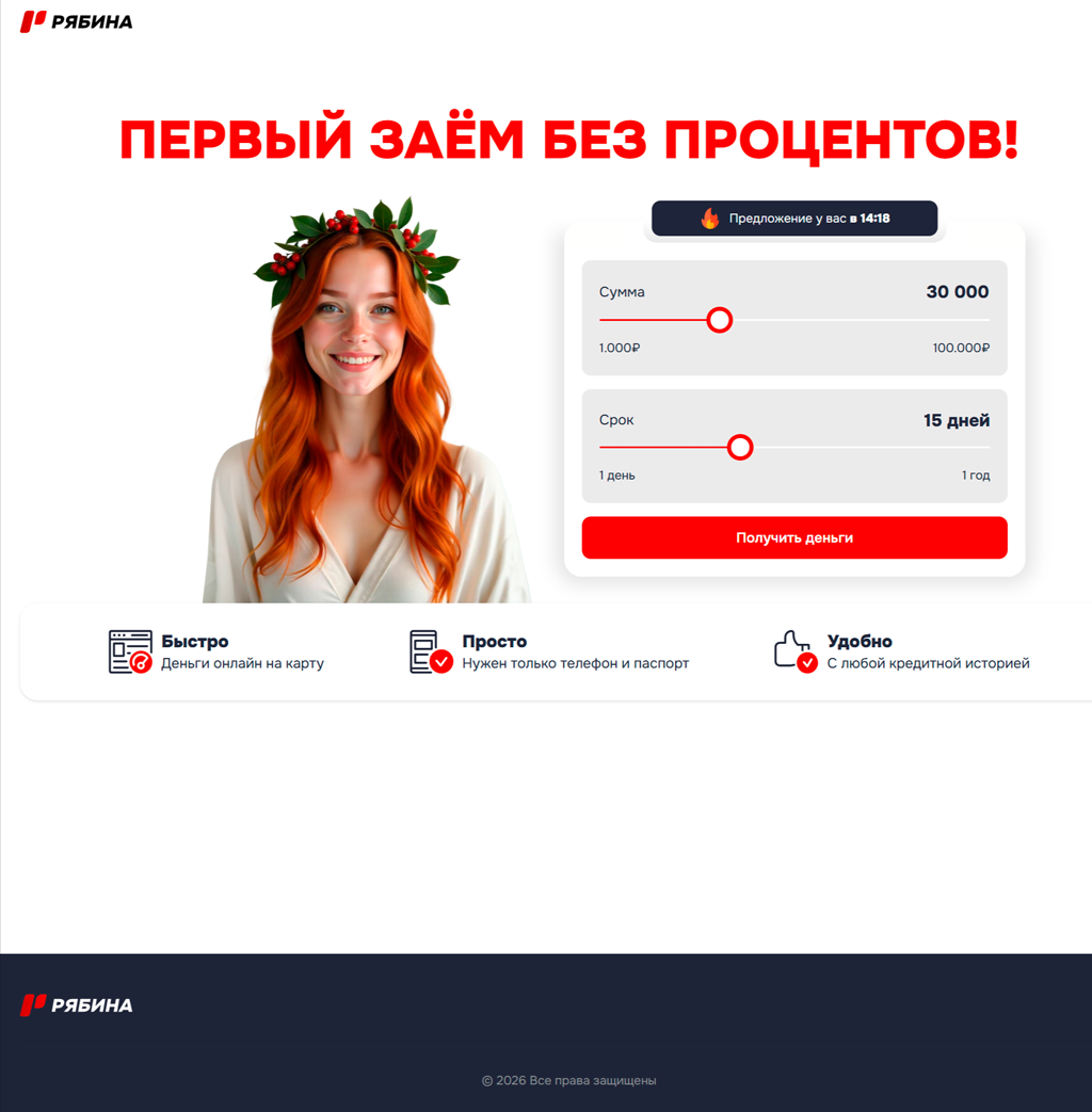 Рябина Кредит (официальный домен ryabina.uno) позиционирует себя как агрегатор микрофинансовых предложений, предоставляющий посреднические услуги по подбору займов. Компания не выдаёт денежные средства напрямую, а обрабатывает заявки пользователей и направляет их в партнёрские МФО.